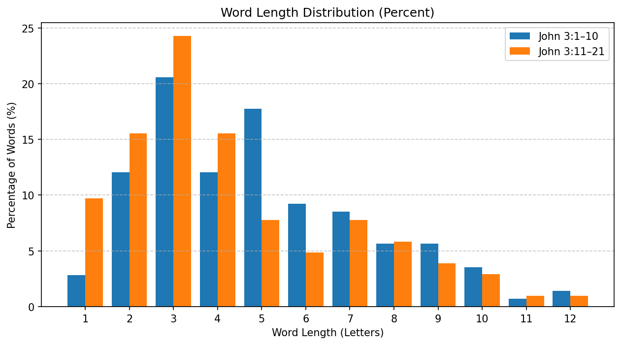 When we compare the two halves of this passage, we find a measurable difference. John 3:1–10 has an average word length of 4.98 letters, while John 3:11–21 averages 4.33 letters per word. A statistical test yields a t-statistic of 2.54 and a p-value of 0.0114. In plain terms, if both passages came from the same source, there would be only about a 1% chance of seeing a difference this large by random variation alone.