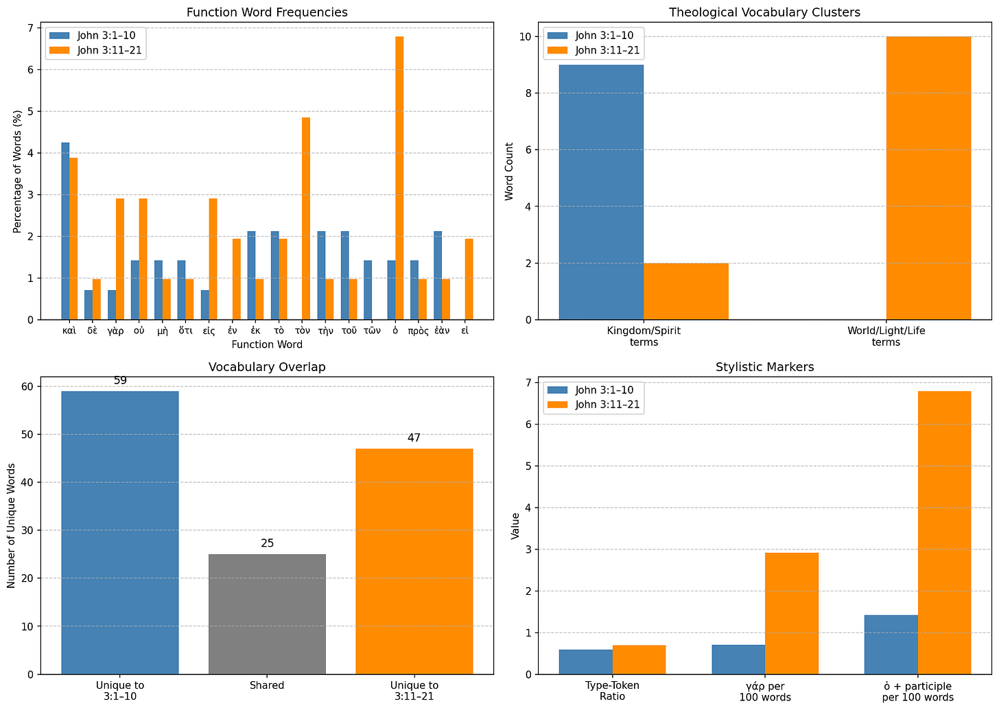 Theological Vocabulary Clusters (top right). This is where things get interesting. I grouped key theological terms into two clusters: “Kingdom/Spirit” terms (βασιλεία, πνεῦμα, and related words) versus “World/Light/Life” terms (κόσμος, φῶς, ζωὴν αἰώνιον, κρίσις). The two passages use almost entirely non-overlapping vocabularies. The first ten verses speak of the kingdom of God, birth, and spirit. From verse 11 onward, we encounter the cosmos, light versus darkness, eternal life, and judgment — the signature themes of Johannine high christology. A Fisher’s exact test yields p = 0.0002, with an infinite odds ratio because there is zero overlap in the expected direction. This is a striking result.